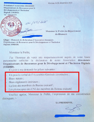Tout commence par une volonté commune de personnes engagées. Pour déclarer ORDID, nous avons dû constituer un dossier complet et rigoureux. La lettre de demande, que nous avons adressée à Monsieur le Préfet du Département du Diamaré, était le cœur de notre envoi.